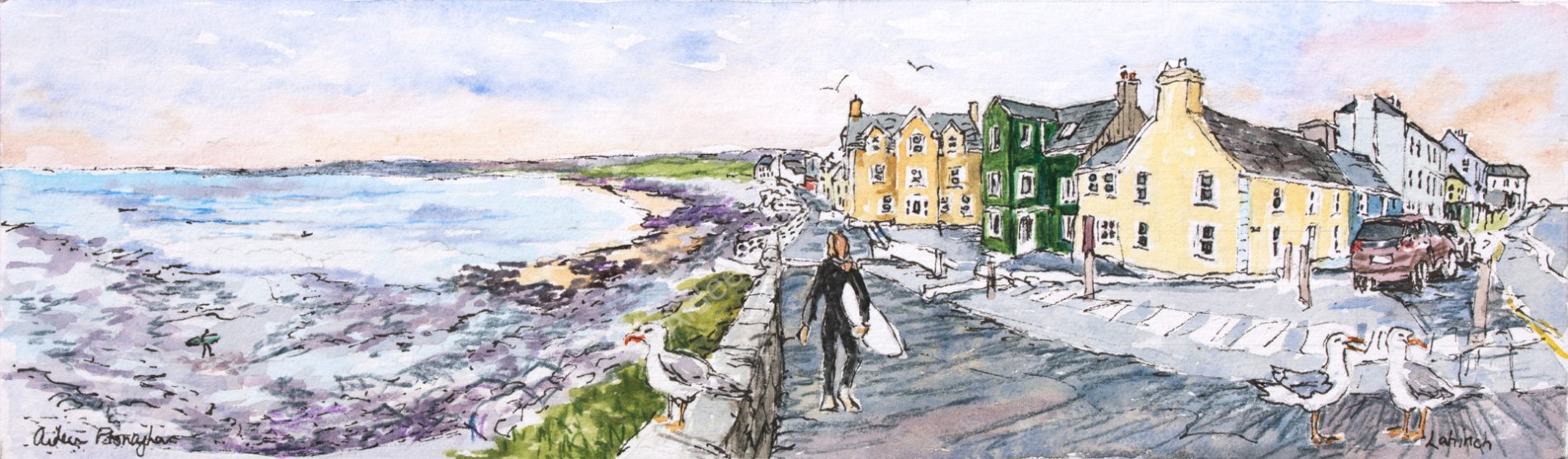 It is panoramic in style and depicts Lahinch promenade, beach and Liscannor bay. The artist’s family are avid surfers and Lahinch is a great location for water sports on the Wild Atlantic Way.