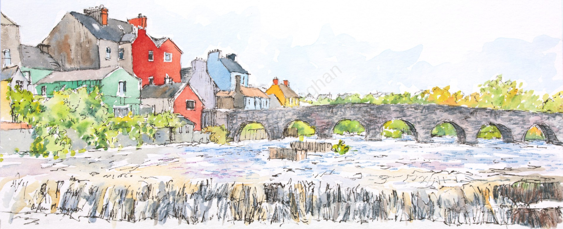 An Irish made open edition Giclee print on Fine Art paper of the beautiful market town of Ennistymon, Co. Clare. The print is based on an original pen and watercolour painting by artist Aideen Monaghan.