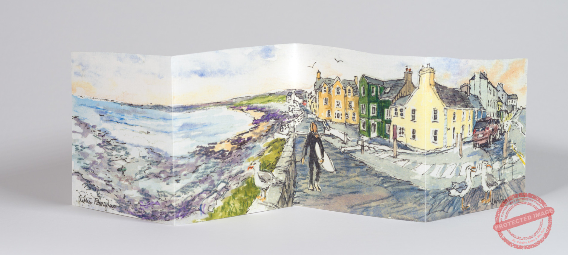 Lahinch is a popular surfing spot on the wild Atlantic way in West Clare. This accordion careering card from a pen and watercolour study by the artist, is a lively depiction of the energy of Lahinch beach and promenade.